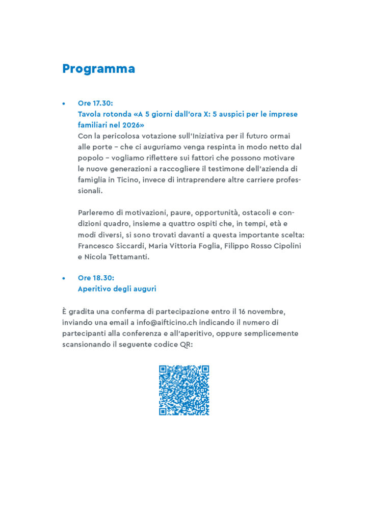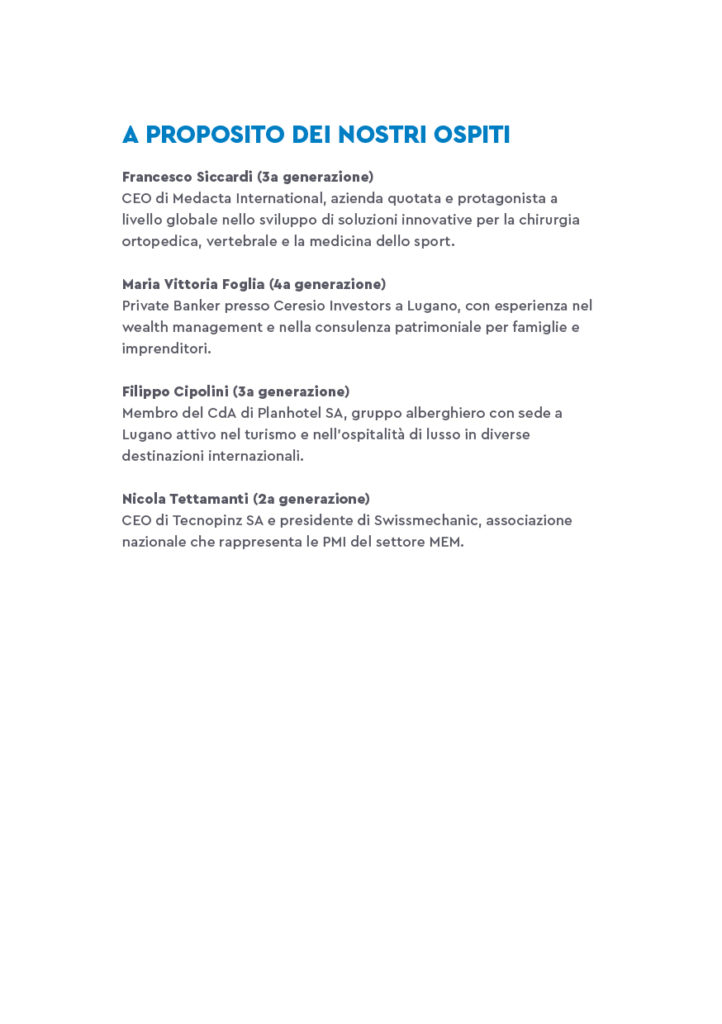 Discuteremo di visione, responsabilità, opportunità e sfide in un contesto economico e normativo in forte evoluzione, insieme a imprenditrici e imprenditori che hanno vissuto direttamente questo passaggio generazionale: Francesco Siccardi, Maria Vittoria Foglia, Filippo Cipolini e Nicola Tettamanti.